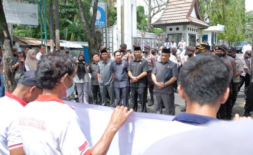 Sejumlah anggota DPRD Kalsel menghadapi aksi unjuk rasa LSM yang menuntut perbaikan jalan longoor Km 171 Satui Tanah Bumbu, di depan Gedung Dewan Jalan Lambung Mangkurat, Banjarmasin, Rabu (5/10/2022). (Humas DPRD Kalsel).