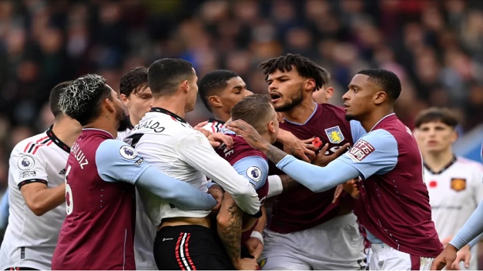 Ronaldo yang tampak frustrasi sempat terlibat cekcok dengan bek lawan, Tyrone Mings. Keduanya saling merangkul bak bermain gulat di depan kotak penalti hingga terjatuh.