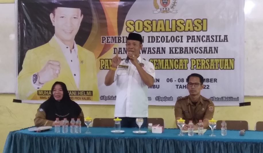 TANAH BUMBU, Kalimantanlive.com – Wakil Ketua Komisi II DPRD Kalsel Muhammad Yani Helmi menanamkan sikap cinta tanah air dan bela negara kepada peserta didik SMA Negeri 1 Kusan Hilir, Kabupaten Tanah Bumbu, melalui penyelenggaraan kegiatan Sosialisasi Ideologi Pancasila dan Wawasan Kebangsaan.