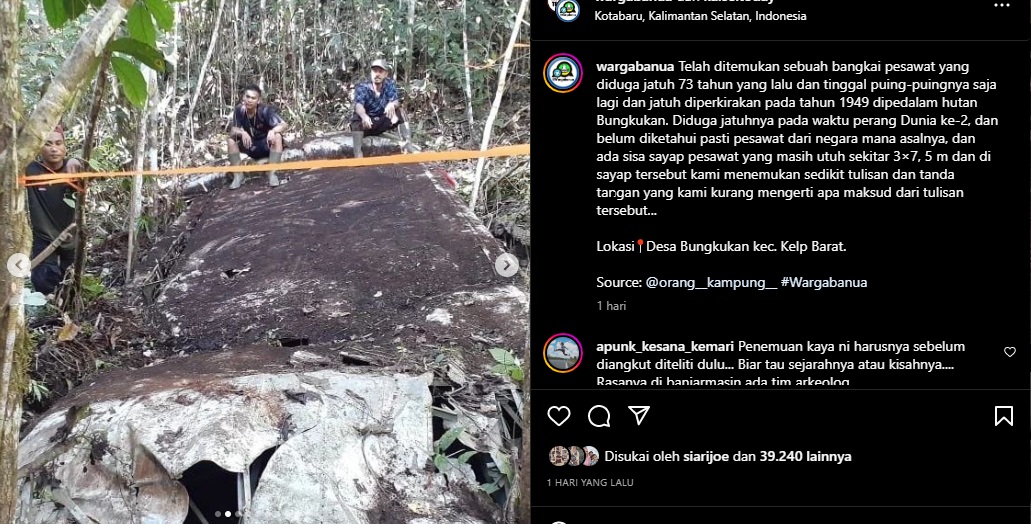 Beberapa foto dan video itu beredar luas di media sosial memperlihatkan ditemukannya bangkai pesawat tempur di tengah hutan Desa Bungkukan, Kelumpang Barat, Kabupaten Kotabaru.