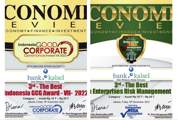 Pada kesempatan ini, Bank Kalsel berhasil memperoleh anugerah penghargaan 3rd The Best GCG Management-VII-2022 (Kategori : Asset Rp 15T – Rp 20T) dan 3rd The Best Indonesia Enteprise Risk Management-V-2022 (Kategori: Asset Rp 15T – Rp 20T).