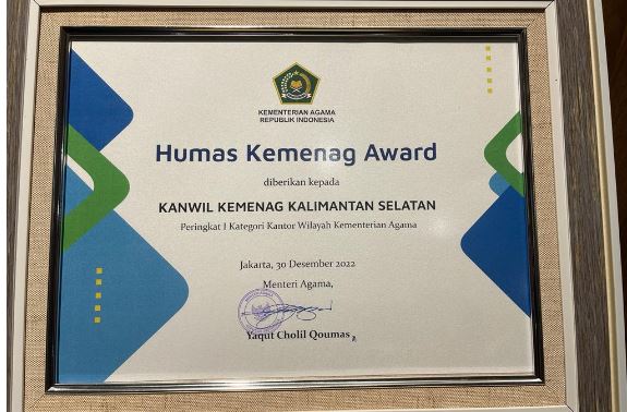 JAKARTA, Kalimantanlive.com – Kementerian Agama (Kemenag) Kalimantan Selatan menerima penghargaan Peringkat 1 Humas Award Tingkat Nasional Tahun 2022 kategori Kantor Wilayah Kementerian Agama dari Menteri Agama RI Yaqut Cholil Qoumas.