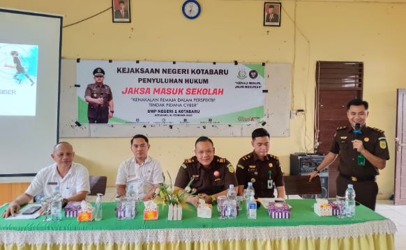 Penyuluhan hukum di SMP Negeri 1 Kotabaru oleh JMS disampaikan Kepala Seksi Intelijen (Kasi Intel) Kejaksaan Negeri (Kejari) Kotabaru Dr M Fikri Nuriana, SH, MH, dengan tema “Kenakalan Remaja Dalam Perspektif Tindak Pidana Siber.