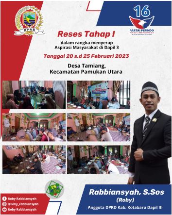 Rabbiansyah menggelar kegiatan reses di satu warga di Desa Tamiang. Hadir dalam kesempatan tersebut kepala dusung, para Ketua RT, tokoh masyarakat, tokoh agama dan warga masyarakat dan kepala desa.