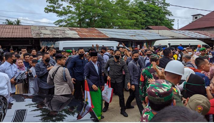 Kedatangannya disambut antusias warga dan para pedagang hingga mengerubuti Orang Nomor Satu di Indonesia yang telah menunggu sejak pagi hari.