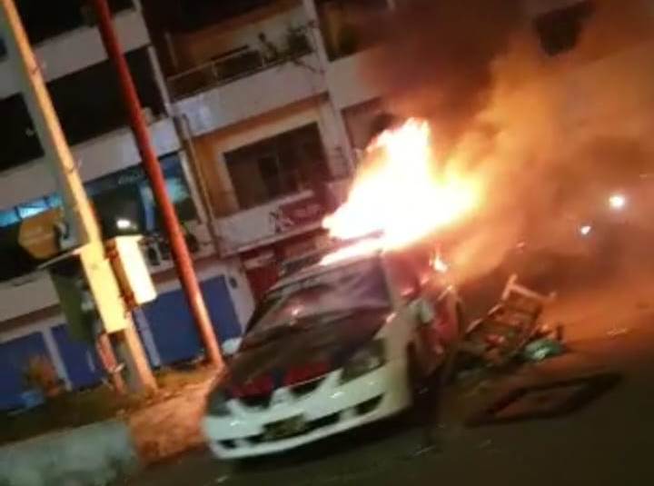 Sebuah mobil diduga milik kepolisian, dibakar. Api berkobar namun tidak ada upaya pemadaman.
