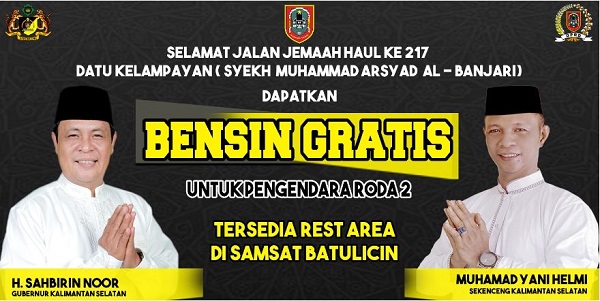 BANJARMASIN, Kalimantanlive.com – Wakil Ketua Komisi II DRPD Kalsel Muhammad Yani Helmi ikut berpartisipasi dalam Peringatan Haul ke-217 Syekh Muhammad Arsyad Al-Banjari atau Datu Kelampayan, dengan menyiapkan ratusan liter BBM gratis jenis pertalite bagi jemaah yang ingin menghadiri haul tersebut.