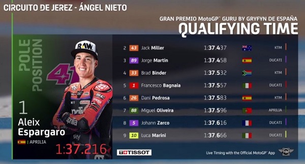 Aleix Espargaro mencatat waktu 1 menit 37,216 detik atau unggul 0,221 detik dari Jack Miller yang ada di posisi kedua.
