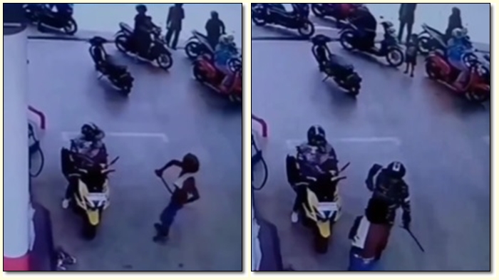 Seperti rekaman kamera CCTV di SPBU tersebut pria tersebut terlihat bergaya mengancam dengan menunjukkan parang yang dibawa ke emak-emak yang naik sepeda motor.