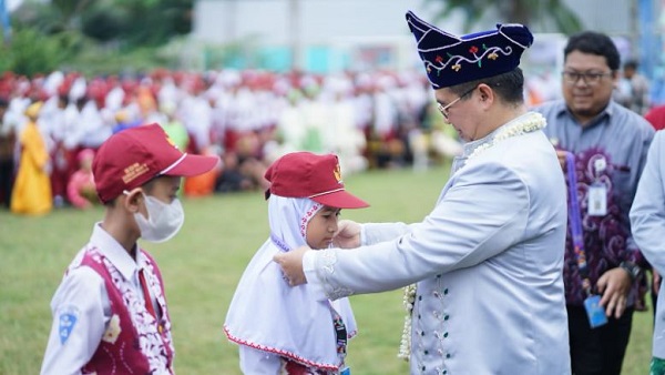 Acara tersebut juga dihadiri ratusan orang siswa-siswi dan guru dari sekolah dari berbagai jenjang, mulai dari PAUD, SD, SMP dan SMA di Kota Seribu Sungai, yang nampak berkumpul di lapangan untuk melaksanakan apel.