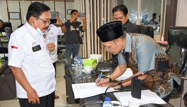 Ketua Komisi IV DPRD Kalsel M Lutfi Saifuddin menandatangani berkas dukungan aspirasi dari Federasi Serikat Pekerja Seluruh Indonesia (FSPSI) Kalsel, Rabu (10/05/2023) . (Humas DPRD Kalsel).