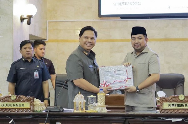Gubernur Kalsel H Sahbirin Noor didampingi Ketua DPRD Kalsel H Supian HK menerima berkas LHP dari Anggota BPK RI Pius dengan predikat WTP ke-10 kali pada rapat Paripurna DPRD Kalsel, Selasa (16/5/2023). (Humas DPRD Kalsel)