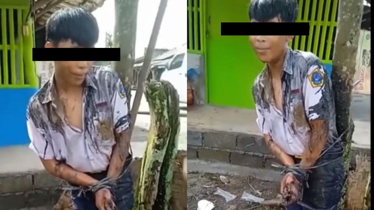Di mana siswa SMP itu sudah diikat di pohon dan diguyur air got oleh teman-temannya.