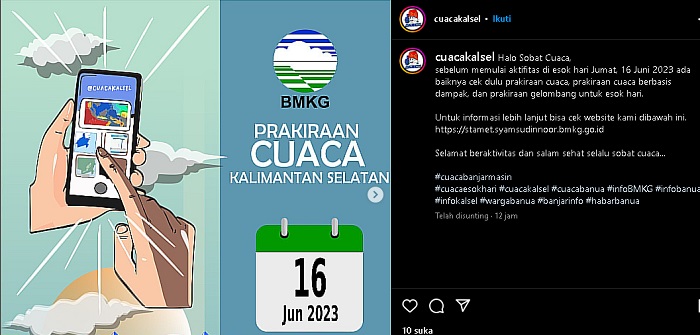 KALIMANTANLIVE.COM – Badan Meteorologi Klimatologi dan Geofisika (BMKG) telah merilis peringatan dini cuaca ekstrem di 16 wilayah di Tanah Air, termasuk Kalimantan Selatan, Jumat (16/6/2023).