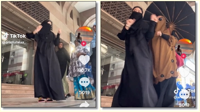 Video itu diunggah oleh akun Tiktok @aruellalalaa__ dan Instagram @indoviral8 itu memperlihatkan seorang wanita muda mengenakan gamis hitam dan juga cadar hitam berjoget TikTok memakai jalan orang yang lewat.