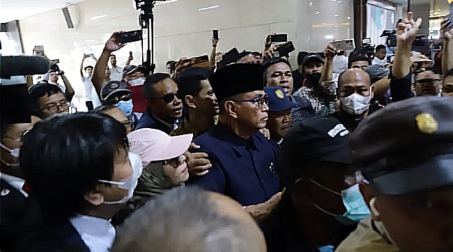 Panji Gumilang didampingi sejumlah penasihat hukumnya saat memenuhi panggilan pemeriksaan di Bareskrim Polri. Bahkan ia juga dikawal para petinggi Ponpes Al-Zaytun.