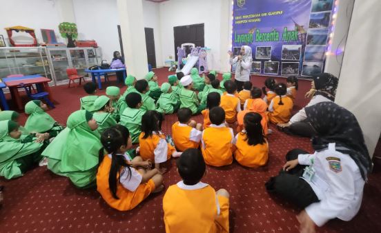 Kedatangan mereka di dampingi oleh para guru, untuk mengikuti kegiatan Layanan Bercerita Anak yang di gagas Dinas Perpustakaan dan Kearsipan Kabupaten Kotabaru.
