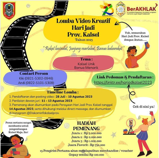 Pemenang akan diumumkan pada perayaan Hari Jadi Provinsi Kalsel pada tanggal 14 Agustus 2023. Serta hubungi melalui direct message dan diumumkan di instagram @diskominfokalselprov.