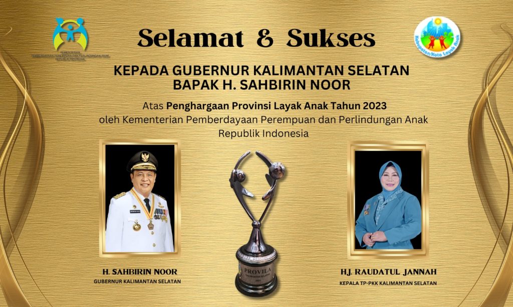 Penghargaan karena berhasil menggerakkan 13 kabupaten dan kota menjadi wilayah Layak Anak, Pemprov Kalsel melaih penghargaan dari Kementerian Perberdayaan Perempuan dan Perlindungan Anak atau Kementrian PPPA.