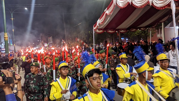 Terlihat para peserta yang masing-masing membawa obor dan bahkan menunjukkan yel-yel dengan penuh semangat dalam peringatan HUT ke-78 Republik Indonesia.