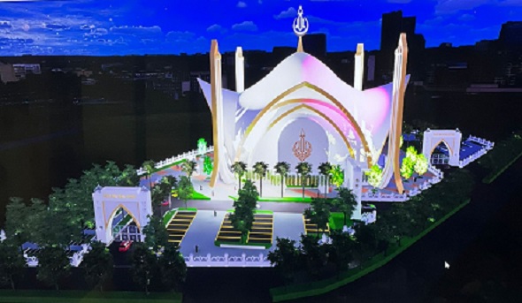CV Navita Konsultan Perencanaan dalam paparan didepan Bupati Kotabaru, Sekretaris Daerah, Ketua Mui, Kepala Kementrian Agama dan Tokoh Agama serta pihak terkait menyampaikan tentang rencana arsitektur bangunan Masjid Agung Husnul Khatimah yang akan dibangun terdiri dari 3 tingkat yang mempunyai 1 kubah 4 menara dengan lampu yang indah.