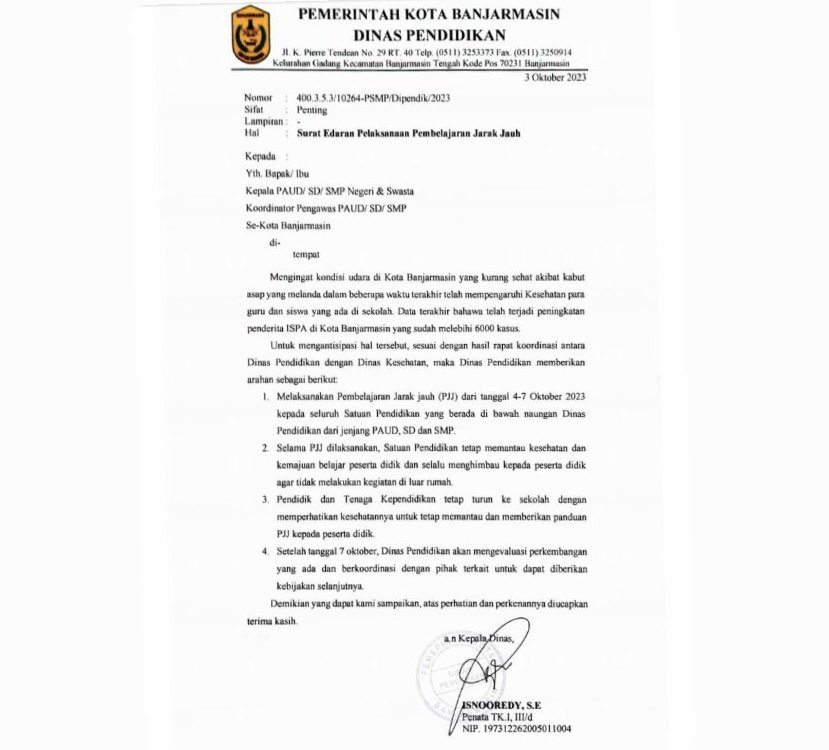 Hal ini tertuang dalam surat bernomor 400.3.5.3/10264-PSMP/Dipendik/2023 yang dibubuhi tanda tangan Sekretaris Dinas Pendidikan Banjarmasin, Isnooredy.