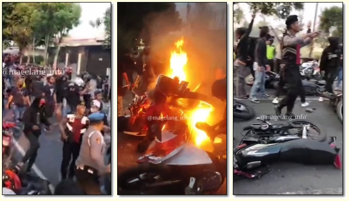 Sepeda motor dibakar saat tawuran di Muntilan, Kabupaten Magelang, Jawa Tengah, terjadi pada Minggu (15/10/2023).