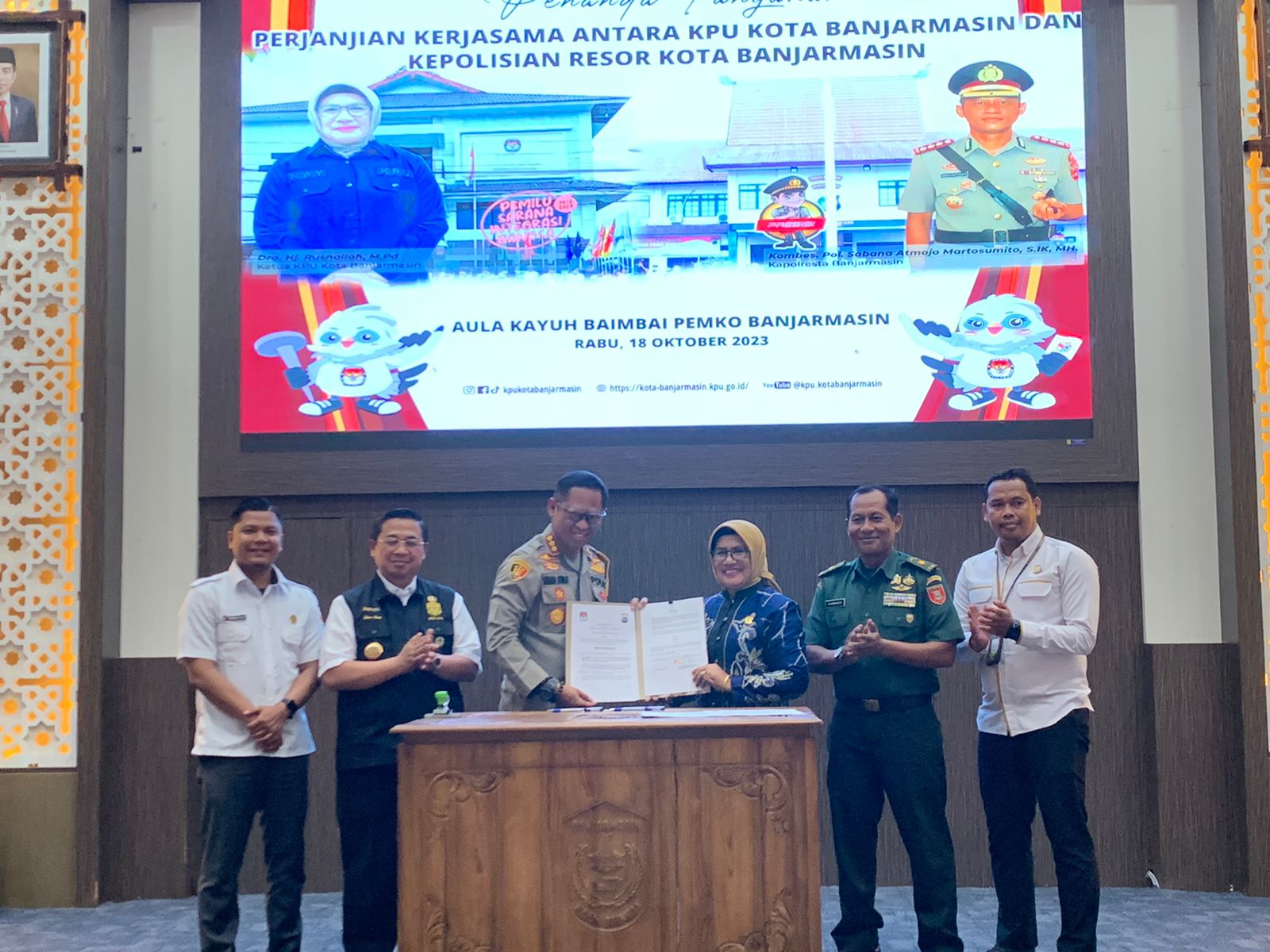 Pada kesempatan itu, dilaksanakan langsung penandatanganan MoU kerja sama antara kedua pihak, yang dilakukan oleh Ketua KPU Kota Banjarmasin, Hj Rusnaillah dan Kapolresta Banjarmasin, Kombes Pol Sabana Atmojo.