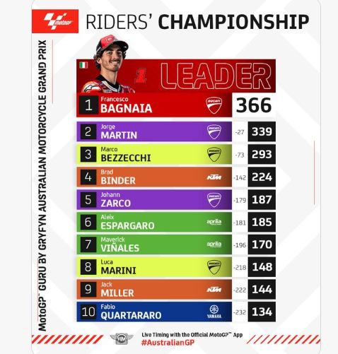 Jack Miller finis di posisi ketujuh, Aleix Espargaro ke delapan, disusul Alex Marquez dan Enea Bastianini finis kesembilan dan ke-10.