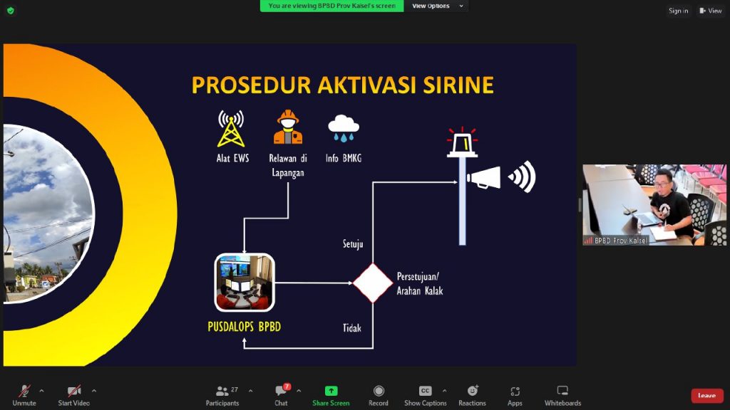 Melalui pertemuan virtual ini, Kepala Sub Bidang Kesiapsiagaan BPBD Kalsel, Ariansyah yang memimpin rapat koordinasi ini juga menyampaikan mekanisme penggunaan alat EWS yang ada.