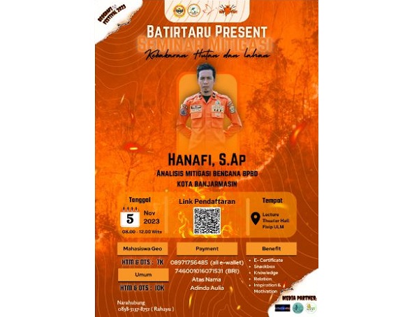 Agenda yang mendatangkan Hanafi S.Ap selaku Analisis Mitigasi Bencana BPBD Banjarmasin nantinya akan dilaksanakan di Lecture Theater Hall FISIP ULM pada 5 November 2023 mendatang.