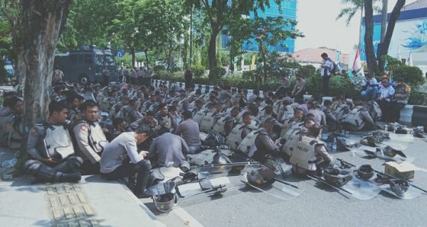 Ratusan polisi diturunkan untuk mengamankan jalannya aksi demo yang diisi dengan orasi para pemimpin serikat pekerja di Kalsel tersebut.
