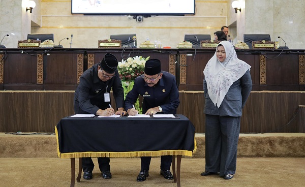 Gubernur Kalsel H Sahbirin Noor dan Ketua DPRD Kalsel H Supian HK menandatangani Persetujuan Raperda APBD Tahun 2024 di DPRD Kalsel, Kamis (16/11/2023). (Humas DPRD Kalsel)