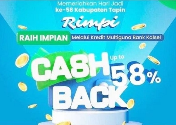 Dalam rangka memperingati momen tersebut dengan tema “Maju Baimbai Gasan Tapin Nang Inovatif WAN Unggul,” Bank Kalsel mempersembahkan promo eksklusif berupa Cashback RIMPI (Raih Impian) melalui Kredit Multiguna Bank Kalsel.