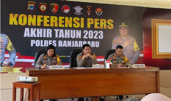 BANJARBARU, Kalimantanlive.com – Kepala Kepolisian Resor Banjarbaru AKBP Dody Harza Kusumah, memaparkan pencapaian Polres Banjarbaru dalam menjaga Keamanan dan Ketertiban Masyarakat (Kamtibmas) sepanjang tahun 2023, pada Konferensi Pers Akhir Tahun 2023 di Aula Joglo Polres Banjarbaru, Jumat (29/12/2023).