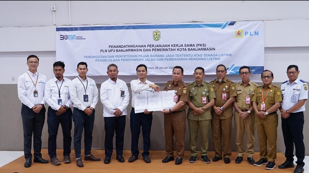 BANJARMASIN, KALIMANTANLIVE.COM – Pemerintah Kota (Pemko) Banjarmasin melaksanakan Penandatanganan Perjanjian Kerja Sama (PKS) dengan UP3 PLN perihal Pemungutan dan Penyetoran Pajak Barang Jasa Tertentu atas Tenaga Listrik, Pengelolaan Penerangan Jalan serta Pembayaran Rekening Listrik, bertempat di Aula Merdeka UP3 PLN Banjarmasin, Senin (8/1/2024).