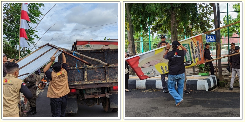 Tampak terlihat petugas gabungan mencopot APK yang berbentuk spanduk kecil dan besar yang kebanyakan dikaitkan pada tiang listrik hingga pepohonan.