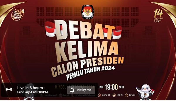 Debat yang akan dimulai pukul 20.00 Wita akan disiarkan secara langsung (live) tvOne, ANTV, Net TV, dan Garuda TV. Debat capres juga bisa ditonton via Link Live Streaming YouTube KPU RI.