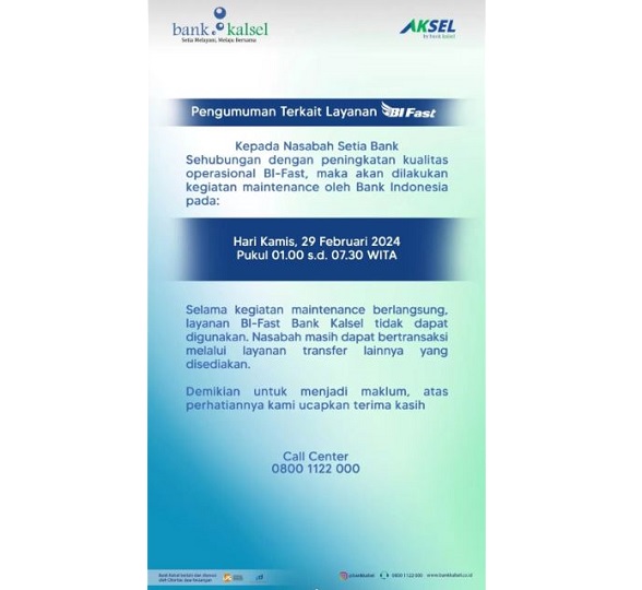 Maintenance yang dilakukan bertujuan untuk memperbaiki dan meningkatkan performa layanan BI-Fast di Bank Kalsel. Meskipun demikian, nasabah Bank Kalsel diimbau untuk bersabar selama kegiatan maintenance tersebut.