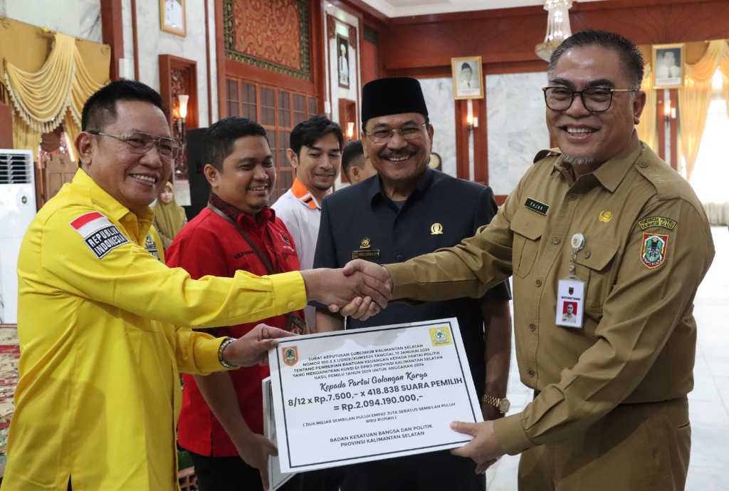“Di tahun ini, jumlah bantuan kepada Parpol yang memiliki kursi di DPRD Kalsel telah ditetapkan sebesar Rp7.500,00 per suara sah untuk perhitungan selama delapan bulan sisa masa jabatan anggota DPRD Kalsel Periode 2019-2024,” ungkap Fajar pada Kegiatan Penyerahan Bantuan Keuangan Partai Politik Tahun Anggaran 2024, di Gedung Mahligai Pancasila Banjarmasin, Senin (1/4/2024).