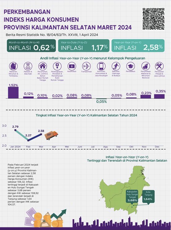 BANJARBARU, KALIMANTANLIVE.COM – Badan Pusat Statistik Kalimantan Selatan (BPS Kalsel) menyatakan di 5 kabupaten dan kota terjadi inflasi y-on-y sebesar 2,58 persen, atau terjadi kenaikan Indeks Harga Konsumen (IHK) dari 103,65 pada Maret 2023 menjadi 106,32 pada Maret 2024.
