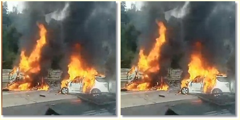 Nahas, satu kendaraan Terios menabrak bus dan Grandmax yang berada di depannya. Mobil tersebut pun ikut terbakar.