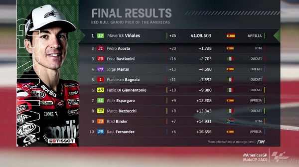 Pembalap Aprilia itu sempat tercecer ke posisi 11 di awal balapan, namun berhasil merengsek ke barisan terdepan, hingga sukses finis terdepan dan mengakhiri lomba sebagai Juara MotoGP Amerika 2024.