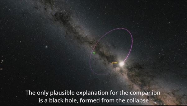 Dalam sistem biner, sebuah bintang yang visibel terlihat mengorbit objek pendamping yang berukuran masif namun tak terlihat, yang mengindikasikan bahwa objek tersebut adalah lubang hitam.