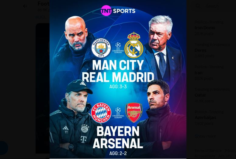 KALIMANTANLIVE.COM – Berikut jadwal siaran langsung leg kedua babak perempatfinal Liga Champions UEFA antara Manchester City vs Real Madrid dan Bayern Munchen vs Arsenal di SCTV dan Vidio, Kamis (18/4/2024) pukul 02.00 WIB.