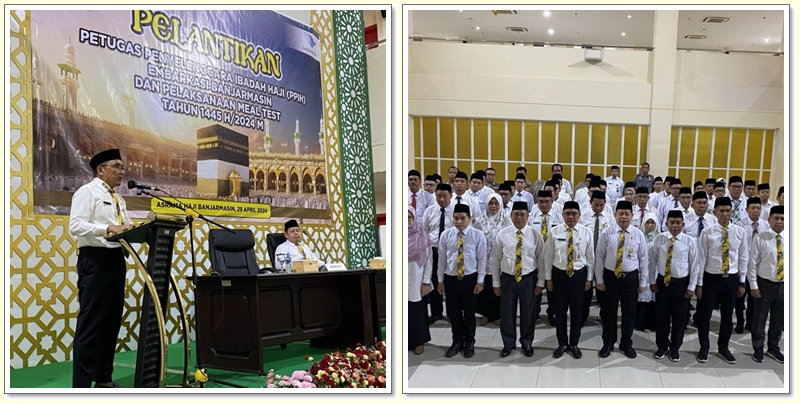 BANJARBARU, KALIMANTANLIVE.COM – Gubernur Kalimantan Selatan, H Sahbirin Noor yang diwakilkan oleh Pelaksana Tugas Kepala Biro Kesejahteraan Rakyat, Ahmad Solhan mengukuhkan Panitia Penyelenggara Ibadah Haji (PPIH) Embarkasi Banjarmasin Tahun 1445H/2024 di gedung Jabal Rahmah Asrama Haji Kalsel di Banjarbaru, Senin (29/04/2024).