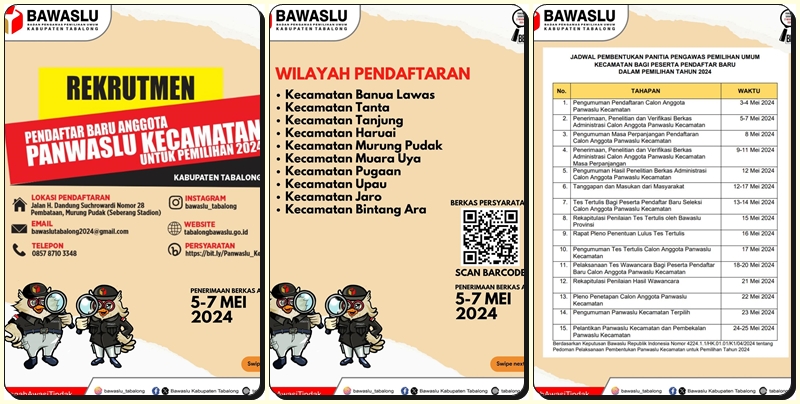 Berdasarkan hasil evaluasi kinerja panwascam existing, proses rekrutmen dibuka untuk 10 kecamatan yakni Banua Lawas, Tanta, Tanjung, Haruai, Murung Pudak, Muara Uya, Pugaan, Upau, Jaro, dan Bintang Ara.