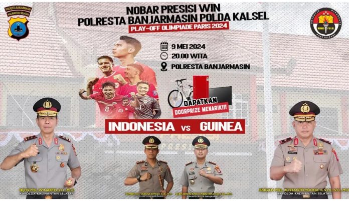 BANJARMASIN, KALIMANTANLIVE.COM – Polresta Banjarmasin menggelar nonton bareng (nobar) laga Timnas U-23 Indonesia vs Guinea untuk memperebutkan satu tiket tersisa ke Olimpiade Paris, Kamis (9/5/2024).
