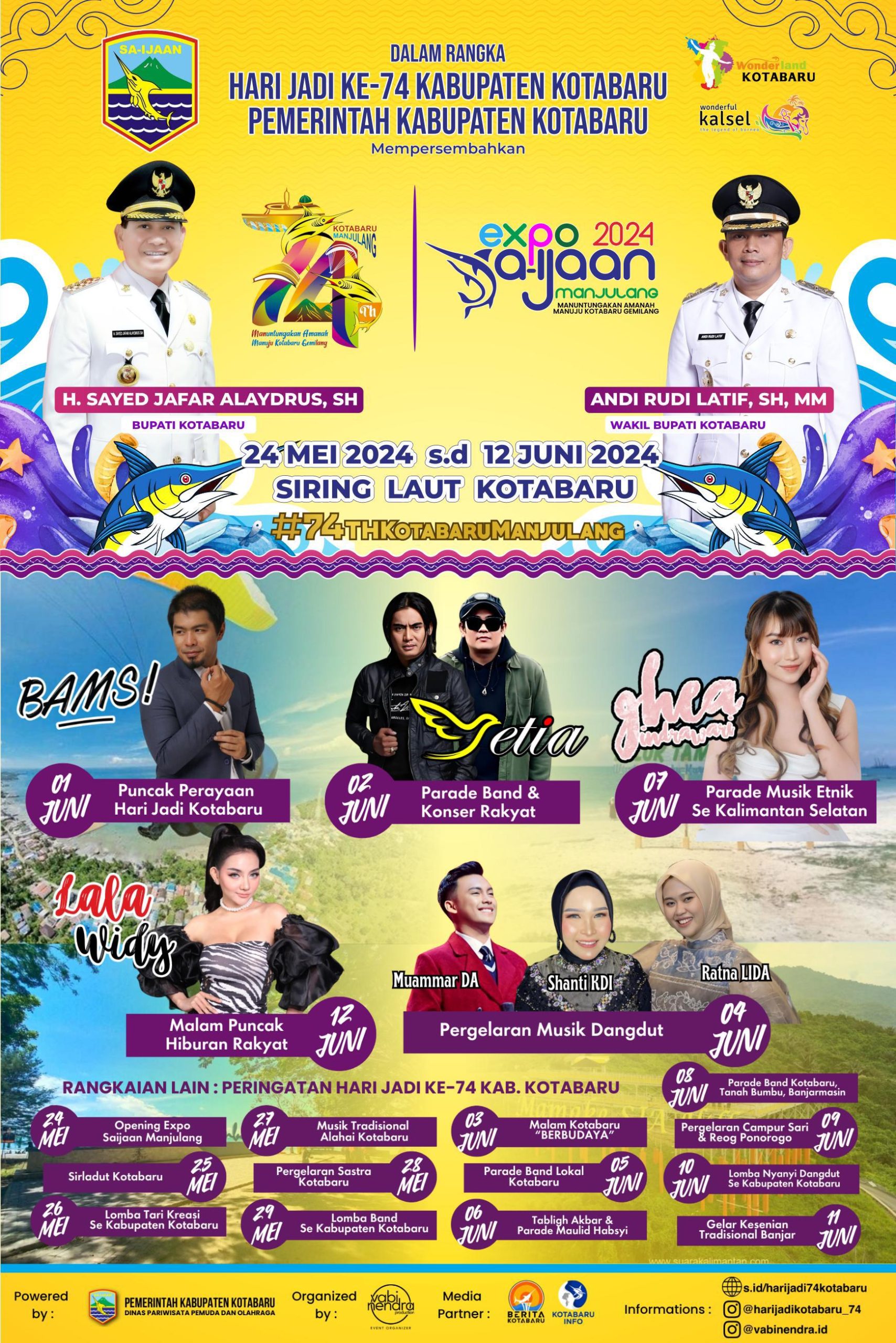 KOTABARU, KALIMANTANLIVE.COM – Pemerintah Kabupaten Kotabaru akan menghadirkan sederet artis ibukota untuk menghibur masyarakat dalam Perayaan Hari Ulang Tahun (HUT) ke- 74 Tahun 2024 ini.