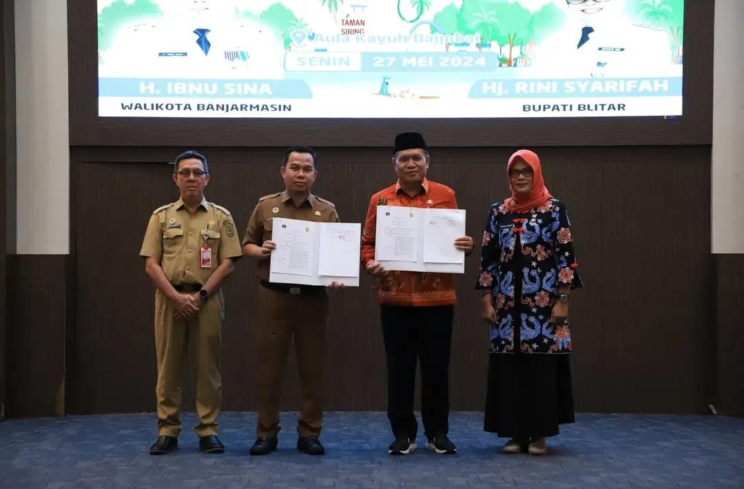 BANJARMASIN, KALIMANTANLIVE.COM – Pemerintah Kota (Pemko) Banjarmasin dan Pemerintah Kabupaten (Pemkab) Blitar melaksanakan Penandatanganan Naskah Kesepakatan Bersama dan Perjanjian Kerja Sama, tentang Peningkatan Perekonomian dan Pengembangan Usaha Mikro, di Aula Kayuh Baimbai, Balaikota Banjarmasin, Senin (27/5/2024).